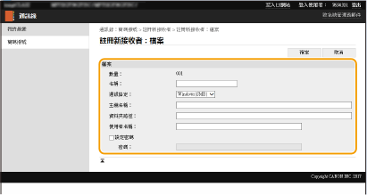 註冊共用資料夾或 FTP 伺服器接收者