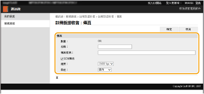 您也可以從控制面板上的 <傳真設定>( <傳送>)指定 [ECM傳送] 和 [速度]。但從 <通訊錄> 進行的設定已為通訊錄中註冊接收者的詳細設定啟用。