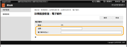 您可以使用電腦在本機的通訊錄中註冊接收者,並編輯註冊接收者的資訊。請在此處指定共用資料夾或 FTP 伺服器。