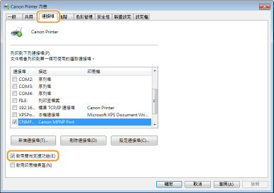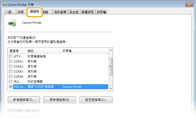 如果選擇之連接埠的 [描述] 是 [Canon MFNP Port],且本機和電腦是在相同的子網路,則會保持連線。您不需要新增連接埠。如果是 [標準 TCP/IP 連接埠],則需要新增連接埠。 設定印表機連接埠