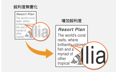 您可以調整影像的銳利度。增加銳利度可銳化模糊的文字和線條,降低銳利度可改善雜誌相片的外觀。 調整銳利度