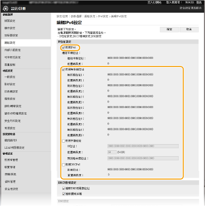 可以透過遠端使用者介面設定本機的 IPv6 位址。設定 IPv6 位址前,請檢查 IPv4 位址設定(檢視 IPv4 設定)。必須指定正確的 IPv4 設定,才能使用 IPv6 位址。請注意,使用掃描器驅動程式或MF Scan Utility的掃描功能不適用於 IPv6 環境。本機可以使用以下多個 IPv6 位址: