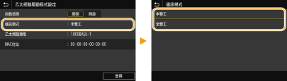 乙太網路是在區域網路 (LAN) 傳遞資料的標準。可以設定通訊模式和乙太網路類型。通常不需變更預設設定就能使用本機(<乙太網路驅動程式設定>),但是您可以根據網路環境變更這些設定。