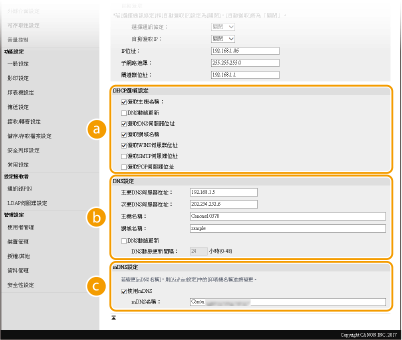勾選此核取方塊可在每次變更本機 IP 位址時動態更新 DNS 記錄。指定更新間隔時,在 [DNS動態更新間隔] 文字框中輸入時間(以小時為單位)。 [mDNS設定][使用mDNS]