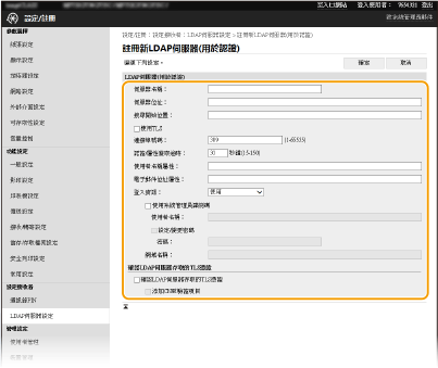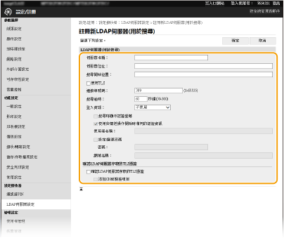 不論是針對搜尋還是認證,都必須分別執行 LDAP 伺服器註冊。若要使用 LDAP 伺服器搜尋傳真和電子郵件接收者,請註冊用於搜尋;若要將它用於認證電子郵件或傳真的傳送,請註冊用於認證。