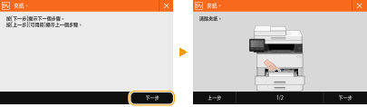 如果紙張卡住,畫面上將會顯示 <夾紙。>。選擇 <下一步> 以顯示簡易的解決方式。如果畫面上的程序難以理解,請參閱下列章節清除卡紙。