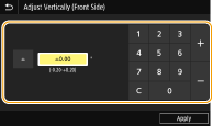 When you adjust the print position, specify the direction using "+" and "-" and the distance using "mm." For <Adjust Vertically (Front Side)>/<Adjust Vertically (Back Side)>, specify a value with a "+" sign to shift the print position in the up-to-down direction. For <Adjust Horizontally (Front Side)>/<Adjust Horizontally (Back Side)>, specify a value with a "+" sign to shift the print position in the left-to-right direction. To shift in the reverse direction, specify a value with a "-" sign.