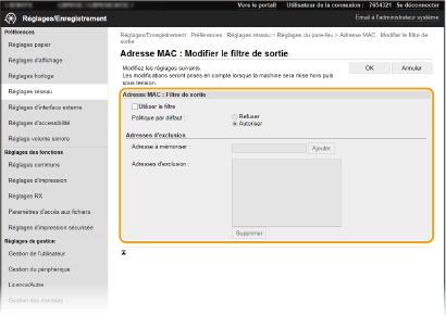 En cas de saisie incorrecte des adresses MAC, vous risquez de pas pouvoir accéder à l'appareil via l'interface utilisateur distante. Si cela se produit, réglez <Filtre d'adresse MAC> sur <Désact.>. <Filtre d'adresse MAC>