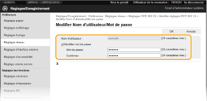 [Modifier mot de passe] Pour définir ou modifier le mot de passe, cochez cette case et saisissez un mot de passe en caractères alphanumériques dans les zones de texte [Mot de passe] et [Confirmer].