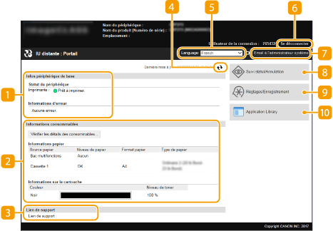 Affiche l'état actuel de l'appareil et les informations d'erreur. En cas d'erreur, le lien vers la page Informations d'erreur apparaît.