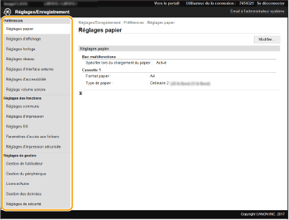 Vous ne pouvez modifier certains réglages que si vous êtes connecté en tant qu'administrateur système.