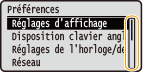 Vous pouvez modifier un grand nombre de réglages relatifs à l'affichage tels que la langue d'affichage. Pour en savoir plus à ce sujet : <Réglages d'affichage>