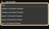 Si l'écran illustré ci-dessus ne s'affiche pas lorsque le papier est chargéSi vous chargez toujours le même papier dans le bac multifonctions, vous pouvez vous épargner les opérations de réglage du format et du type de papier à chaque impression en les définissant par défaut. Notez que si un réglage par défaut est enregistré, l'écran illustré ci-dessus ne s'affiche pas. Pour afficher l'écran, sélectionnez <Spécifier lors du chargement du papier> (Enregistrement des paramètres papier par défaut du bac multifonctions).