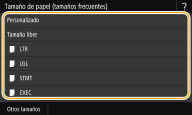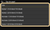 Si la pantalla anterior no aparece cuando hay papel cargadoSi siempre carga el mismo papel en la bandeja multiuso, puede omitir las operaciones de configuración del papel registrando el tamaño y el tipo de papel como opción predeterminada. Sin embargo, si se registra la opción predeterminada, la pantalla anterior no aparecerá. Para visualizar la pantalla, seleccione <Especificar cuando cargue papel> (Registro de las opciones de papel predeterminadas para la bandeja multiuso).
