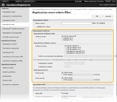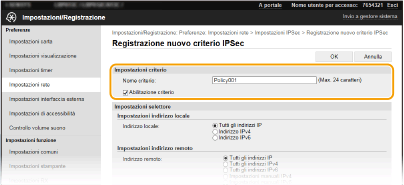 Se viene selezionato [Impostazioni manuali IPv4] o [Impostazioni manuali IPv6] per [Indirizzo remoto], immettere l'indirizzo IP per applicare il criterio. È anche possibile immettere un intervallo di indirizzi inserendo un trattino tra gli indirizzi.