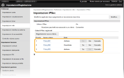 Prima di utilizzare IPSec per la comunicazione crittografata è necessario registrare i criteri di protezione (SP). Un criterio di protezione è costituito dal gruppo di impostazioni descritte di seguito. Dopo la registrazione dei criteri, specificare l'ordine con cui sono applicati.