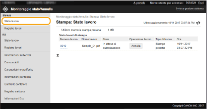 Fare clic su [Numero lavoro] sui documenti in pausa e i documenti protetti per visualizzare informazioni dettagliate. È possibile controllare nome utente e numero di pagina del documento stampato.