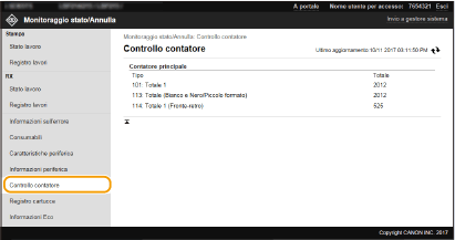 Vengono visualizzati il formato e il tipo di carta nell'alimentazione, il numero del modello della cartuccia del toner e altre informazioni. È possibile anche fare clic su [Verifica dettagli consumabili] nella pagina Portale (pagina principale) per visualizzare questa pagina (