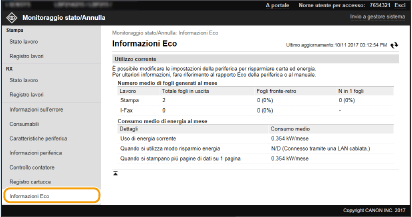Vengono visualizzati il volume totale mensile di stampe e il consumo di energia totale mensile. È possibile visualizzare la schermata Informazioni Eco e modificare le impostazioni per risparmiare carta ed energia.