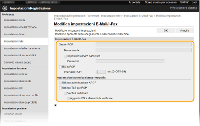 Selezionare la casella di controllo per crittografare la comunicazione con il server POP3 con TLS. Selezionare la casella di controllo relativa a [Verifica certificato] o [Aggiunta CN a elementi da verificare] in base alle esigenze.