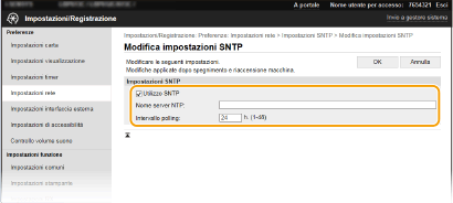 Verifica della comunicazione con il server NTP/SNTPÈ possibile visualizzare lo stato della comunicazione con il server registrato facendo clic su [Impostazioni/Registrazione]