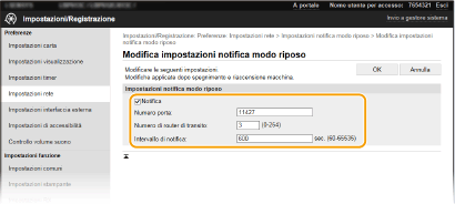 Selezionare la casella di controllo per informare il software di gestione dei dispositivi sullo stato di alimentazione della macchina. Quando viene selezionato [Notifica] la macchina eviterà comunicazioni non necessarie nella modalità riposo e ridurrà il consumo totale di energia. [Numero porta]