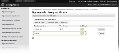 Una clave y un certificado no pueden eliminarse si se utilizan actualmente para algún fin, como cuando aparecen "[TLS]" o "[IEEE 802.1X]" en [Uso de clave]. En este caso, deshabilite la función o sustituya la clave y el certificado antes de eliminarlos.