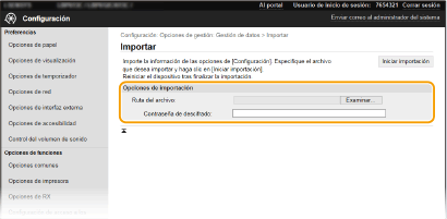 Los datos de opciones del equipo pueden guardarse en su ordenador (exportación). Los datos guardados en su ordenador también se pueden registrar en el equipo (importación). Los datos exportados desde este equipo se pueden importar en otro equipo del mimo modelo. Así, podrá copiar fácilmente varios datos de opciones en múltiples equipos. Para utilizar esas características, tiene que haber iniciado una sesión en el modo de Administrador del sistema.