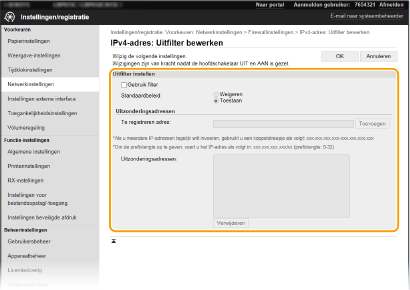 Als u IP-adressen verkeerd invoert, kunt u het apparaat mogelijk niet bereiken vanuit de UI op afstand. Om dat op te lossen, moet u <IPv4-adresfilter> of <IPv6-adresfilter> instellen op <Uit>.