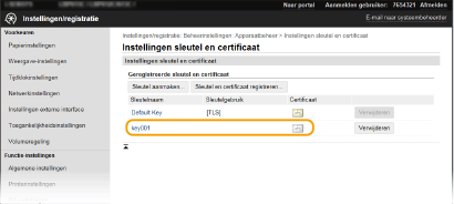 U kunt een sleutelpaar niet verwijderen als dit momenteel in gebruik is, bijvoorbeeld wanneer "[TLS]" of "[IEEE 802.1X]" wordt weergegeven onder [Sleutelgebruik]. In dat geval moet u de functie uitschakelen of het sleutelpaar vervangen voordat u het sleutelpaar kunt verwijderen.