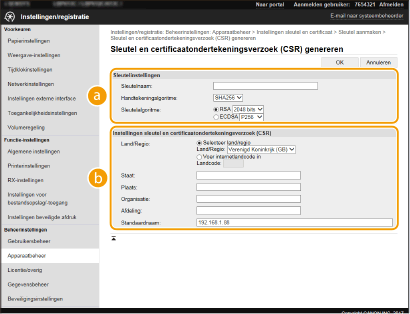 Op het apparaat gegenereerde certificaten hebben geen CA-handtekening, een communicatiefout kan het gevolg zijn, afhankelijk van de apparaten waarmee het communiceert. Voordat de certificeringsinstantie het certificaat met CA-handtekening kan afgeven, moet u CSR-gegevens (Certificate Signing Request) verkrijgen die de beheerder van de UI op afstand kan genereren. Als het certificaat is verstrekt, registreer het dan in de sleutel met de gegenereerde CSR.