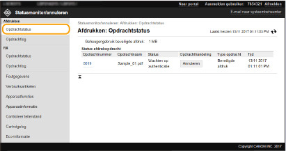 Ongeacht de instelling van Afdeling-ID beheer, bevat de lijst alle afdruktaken die worden afgedrukt en die wachten op afdrukken.