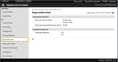 De maximale afdruksnelheid en de apparaatfuncties verschijnen.