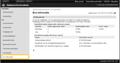 Het maandelijkse afdruktotaal en het maandelijkse stroomverbruik worden weergegeven. U kunt het scherm Eco Information oproepen en de instellingen veranderen om papier te besparen en het stroomverbruik te verminderen.