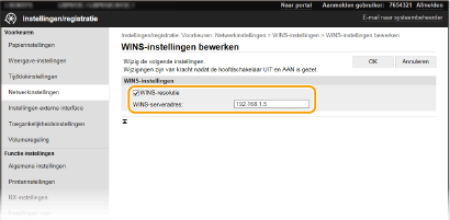 Als het IP-adres van de WINS-server wordt verkregen van een DHCP-server, heeft het verkregen IP-adres prioriteit boven het IP-adres dat is ingevoerd in het vak [WINS-serveradres].
