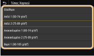 Δεν εμφανίζεται η οθόνη που απεικονίζεται πιο πάνω όταν έχει τοποθετηθεί χαρτί.Εάν τοποθετείτε πάντα το ίδιο χαρτί στον δίσκο πολλαπλών χρήσεων, μπορείτε να παρακάμψετε τις ενέργειες ρύθμισης χαρτιού, καταχωρίζοντας το μέγεθος και τον τύπο χαρτιού ως προεπιλεγμένη ρύθμιση. Ωστόσο, όταν έχει καταχωριστεί η προεπιλεγμένη ρύθμιση, δεν εμφανίζεται η οθόνη που απεικονίζεται πιο πάνω. Για να εμφανίσετε την οθόνη, επιλέξτε <Ορίστε το Χρόν Τοποθ Χαρτ> (Καταχώριση προεπιλεγμένων ρυθμίσεων χαρτιού για τον δίσκο πολλαπλών χρήσεων).