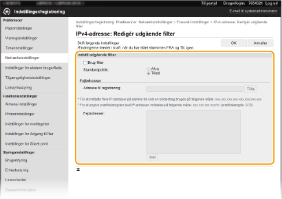 Hvis IP-adresserne er indtastet forkert, kan du muligvis ikke få adgang til maskinen fra Brugerinterface til fjernbetjening. I dette tilfælde skal du angive <IPv4-adressefilter> eller <IPv6-adressefilter> til <Fra>.