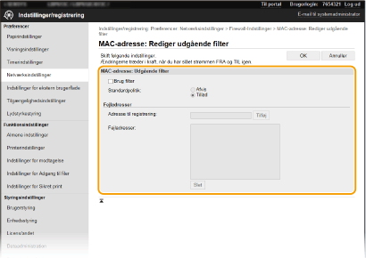 Hvis MAC-adresserne er indtastet forkert, kan du muligvis ikke få adgang til maskinen fra Brugerinterface til fjernbetjening. I dette tilfælde skal du angive <MAC-adressefilter> til <Fra>. <MAC-adressefilter>