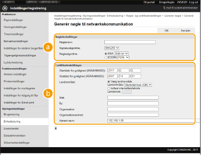 Der kan genereres en nøgle og et certifikat med maskinen, når det er nødvendigt til krypteret kommunikation via TLS (Transport Layer Security). Du kan bruge TLS, når du har adgang til maskinen via Brugerinterface til fjernbetjening. Der bruges selvsignerede certifikater med den nøgle og det certifikat, der er blevet genereret i "Netværkskommunikation".