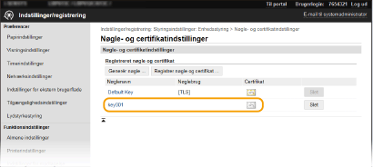 Det er ikke muligt at slette en nøgle og et certifikat, hvis det aktuelt bruges til et formål, f.eks. når "[TLS]" eller "[IEEE 802.1X]" vises under [Nøglebrug]. I dette tilfælde skal du deaktivere funktionen eller erstatte nøglen og certifikatet, før du sletter det.