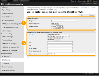 Da certifikater, der er blevet genereret på maskinen, ikke har en CA-signatur, kan der opstå en kommunikationsfejl afhængigt af de enheder, som den forsøger at kommunikere med. For at få certifikatmyndigheden til at udstede certifikatet med CA-signaturen skal du indhente data for CSR (Certificate Signing Request), som administratoren kan generere fra Brugerinterface til fjernbetjening. Når certifikatet er blevet udstedt, skal du registrere det i nøglen med den genererede CSR.