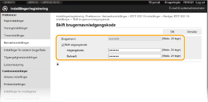 Hvis du vil indstille eller ændre adgangskoden, skal du markere afkrydsningsfeltet og angive alfanumeriske tegn for den nye adgangskode både i tekstfeltet [Adgangskode] og [Bekræft]. |