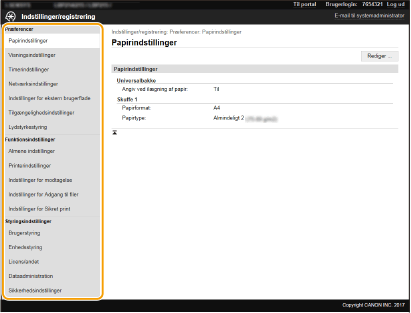 Du kan ændre de forskellige indstillinger for maskinen ved at bruge Brugerinterface til fjernbetjening. De fleste indstillinger kan også angives i maskinen, men nogle indstillinger kan kun angives ved at bruge Brugerinterface til fjernbetjening. I dette afsnit beskrives den grundlæggende proces for at ændre maskinens indstillinger ved hjælp af Brugerinterface til fjernbetjening.