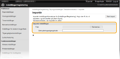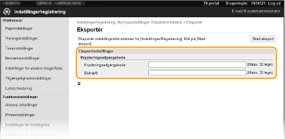 Maskinindstillingsdata kan gemmes på din computer (eksport). Data, der er gemt på din computer, kan også registreres i maskinen (import). Data, der er eksporteret fra denne maskine, kan importeres til en anden maskine af tilsvarende model. Du kan derfor nemt kopiere forskellige dataindstillinger til flere maskiner. Hvis du vil bruge disse funktioner, skal du være logget på i systemadministratorstatus.