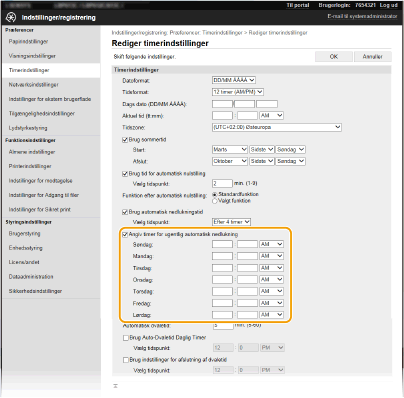 *Hvis strømmen ikke kan slukkes automatisk på det angivne tidspunkt, vil der blive forsøgt igen op til ti gange med et minuts interval. Hvis strømmen ikke kan slukkes efter ti forsøg, er det umuligt at udføre automatisk slukning for den pågældende dag.