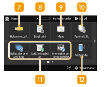 Mængde, der er tilbage i tonerpatronerneViser mængden af resterende toner i patronerne i intervaller. Dette er skjult, mens skærmen Hjem er aktiv.