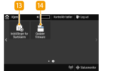 <Statusmonitor>Tryk for at kontrollere udskrivningsstatus, for at se brugshistorikken eller for at se netværksindstillinger som f.eks. maskinens IP-adresse. Du kan også tjekke maskinens status, f.eks. den resterende mængde papir eller den resterende mængde i tonerpatronerne, eller om der er opstået fejl. <Statusmonitor>-skærmen