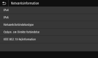 Viser netværksindstillinger som f.eks. maskinens IP-adresse og status såsom tilstanden for trådløs LAN-kommunikation.