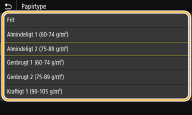 Hvis den skærm, der er angivet herover, ikke vises, når der er ilagt papirHvis du altid ilægger det samme papir i universalbakken, kan du springe betjeningen af papirindstillingerne over ved at registrere papirformatet og papirtypen som standardindstillingen. Når standardindstillingen er blevet registreret, vil den skærm, der er angivet herover, imidlertid ikke blive vist. Hvis du vil vise skærmen, skal du vælge <Angiv ved ilægning af papir> (Registrering af standardpapirindstillinger for universalbakken).