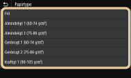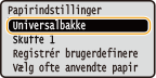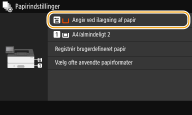 Når standardindstillingen er registreret, vises skærmen for papirindstillinger ikke, når der ilægges papir, og den samme indstilling bruges hver gang. Hvis du ilægger et andet papirformat eller en anden papirtype uden at ændre papirindstillingerne, kan maskinen ikke udskrive korrekt. For at undgå dette problem skal du vælge <Angiv ved ilægning af papir> i trin 3 og derefter ilægge papiret.